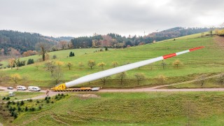 Voraussichtlich ab dem 20. November, gegen 9:00 Uhr, steht der Transport der drei 68 Meter langen Rotorblattteile zur Baustelle bevor. Für den Transport über die ca. 7 Kilometer lange Strecke von der Umladefläche an der B33 bis zum Anlagen-Standort werden Spezialfahrzeuge eingesetzt, die sich per Fernsteuerung bedienen lassen.
