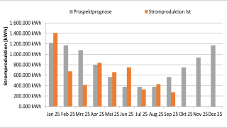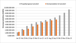 | Monat | Prospektprognose | Prospektprognose kumuliert | Stromproduktion Ist | Stromproduktion Ist kumuliert |
