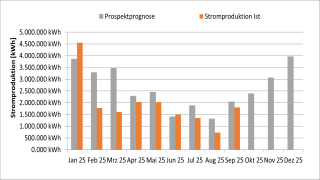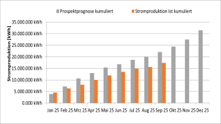 | Monat | Prospektprognose | Prospektprognose kumuliert | Stromproduktion Ist | Stromproduktion Ist kumuliert |