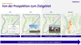 Wir haben das Aufsuchungsgebiet über mehrere Jahre hinweg intensiv geologisch untersucht und von einem Expertenrat überprüfen lassen. Der Suchraum – also das für die Bohrungen geeignete Gebiet – wurde dadurch nach und nach verkleinert. Von ursprünglich 19 Kommunen blieb schließlich nur noch die Gemeinde Hartheim übrig.