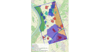 Der Bereich des Tiefenwasserreservoirs, das den Zielpunkt unserer beiden Bohrungen darstellt, ist in grauer Farbe dargestellt. Um dieses Reservoir mit den Bohrungen gut erreichen zu können, müssen verschiedene Voraussetzungen erfüllt sein. Die blaue Fläche zeigt das Gebiet, das dadurch als oberirdischer Standort für eine Anlage in Frage kommt. Die Schnittmenge zwischen der lachsfarbenen und der blauen Fläche ergibt die konkret geeigneten Bereiche für den Bau einer Anlage („blau schraffiert“), denn dort sind alle Standortkriterien erfüllt. Von dort aus verlaufen die beiden Bohrungen in den grau markierten Bereich.