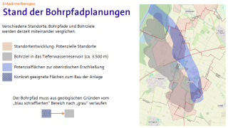 Die Bohrungen verlaufen also nicht senkrecht ca. 3.500 Meter nach unten, sondern werden abgelenkt. Das hat den Vorteil, dass mehr Tiefenwasser erschlossen und somit mehr Wärme produziert werden kann. Derzeit sichern wir geeignete Grundstücke für die Bohrungen und den Betrieb der Anlage.