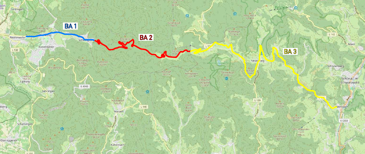 Die Arbeiten innerhalb des Windparks Sirnitz/Dreispitz bei Müllheim gehen stetig voran. Im Sommer 2026 sollen die Rotorblätter für die Windenergieanlagen von der Umladefläche in Müllheim-Niederweiler mit einem Spezialfahrzeug zum Windpark gefahren werden. Die Transportroute folgt der L131 vom Sportplatz Niederweiler bis zum Wanderparkplatz am Kreuzweg. Die hierfür notwendigen Vorarbeiten erfolgen in zwei Abschnitten: