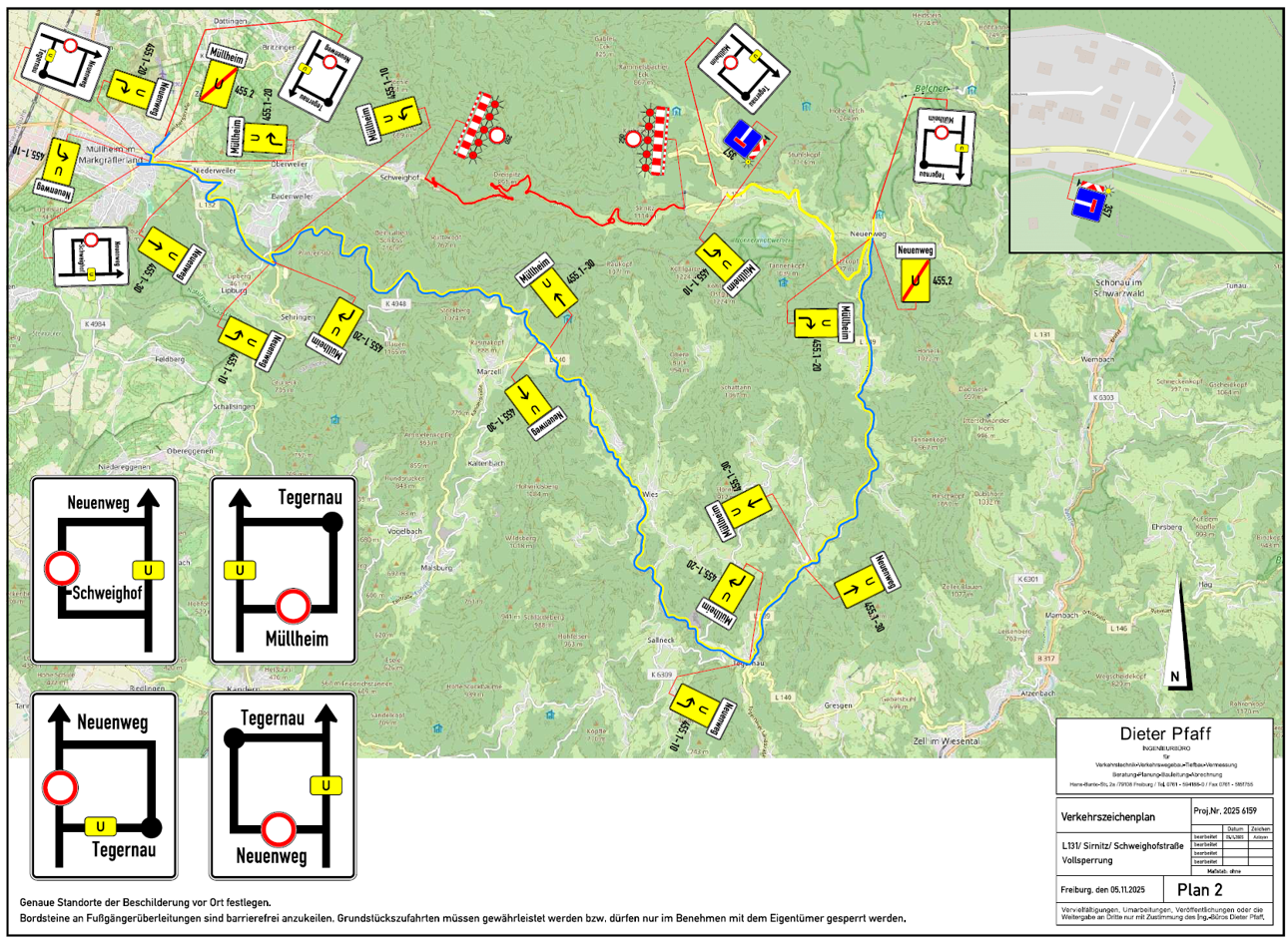 - In der Woche vom 15.12. – 19.12.2025 werden Arbeiten ab dem Ortseingang Badenweiler-Oberweiler bis Ortsende Schweighof „Forellenzucht“ durchgeführt. Um die Sicherheit des Straßenverkehrs zu gewährleisten, wird die Straße stellenweise einseitig gesperrt, wobei an der Wanderbaustelle vorbeigefahren werden kann.